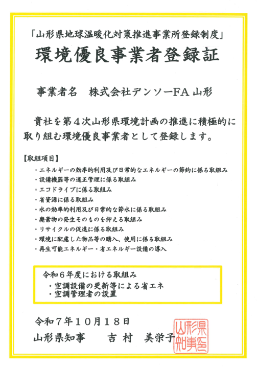 この度、デンソーFA山形は山形県より「環境優良事業者」として表彰されました。